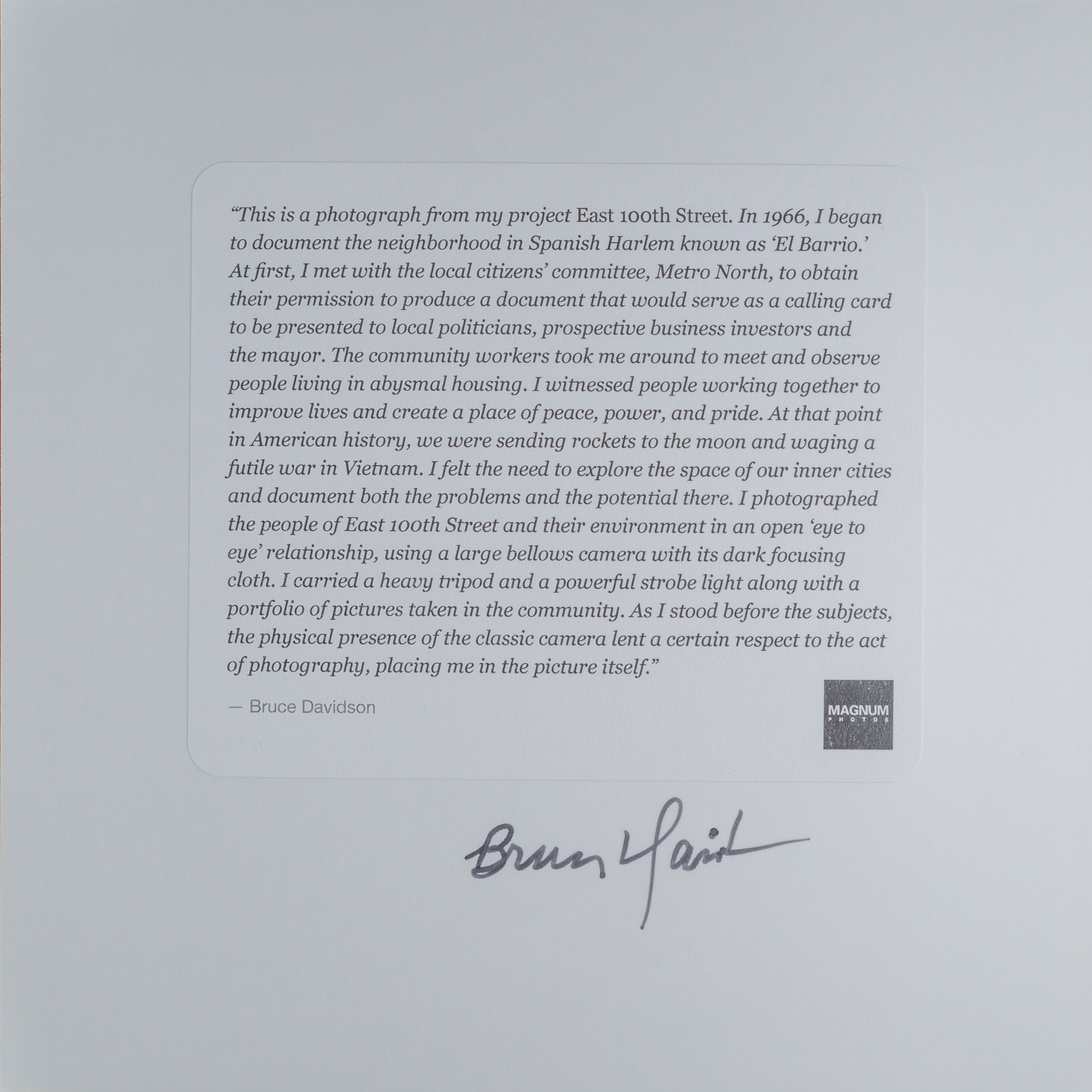 当时,美国正将火箭送往月球,同时也在越南打着一场徒劳的战争。我感到有必要深入城市内核的空间,去记录其中的问题与潜力。我以一种开放的“眼对眼”关系,拍摄 East 100th Street 的居民和环境,使用一台配有黑布对焦罩的大型风箱相机。我携带沉重的三脚架和强力闪光灯,还带上了一整套在社区中拍摄的影像作品。