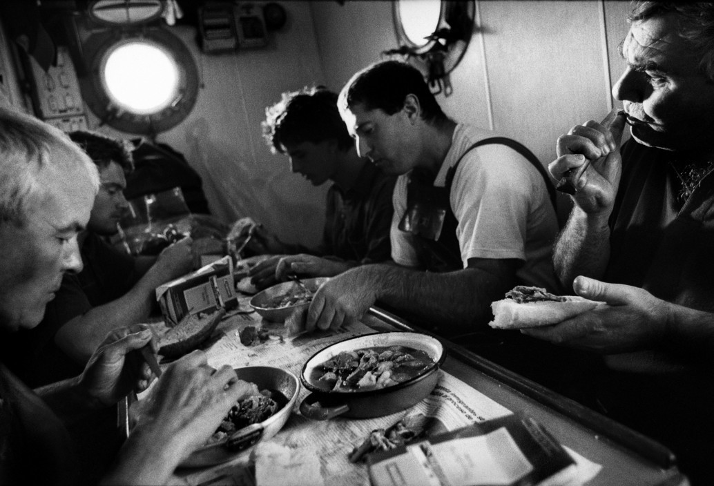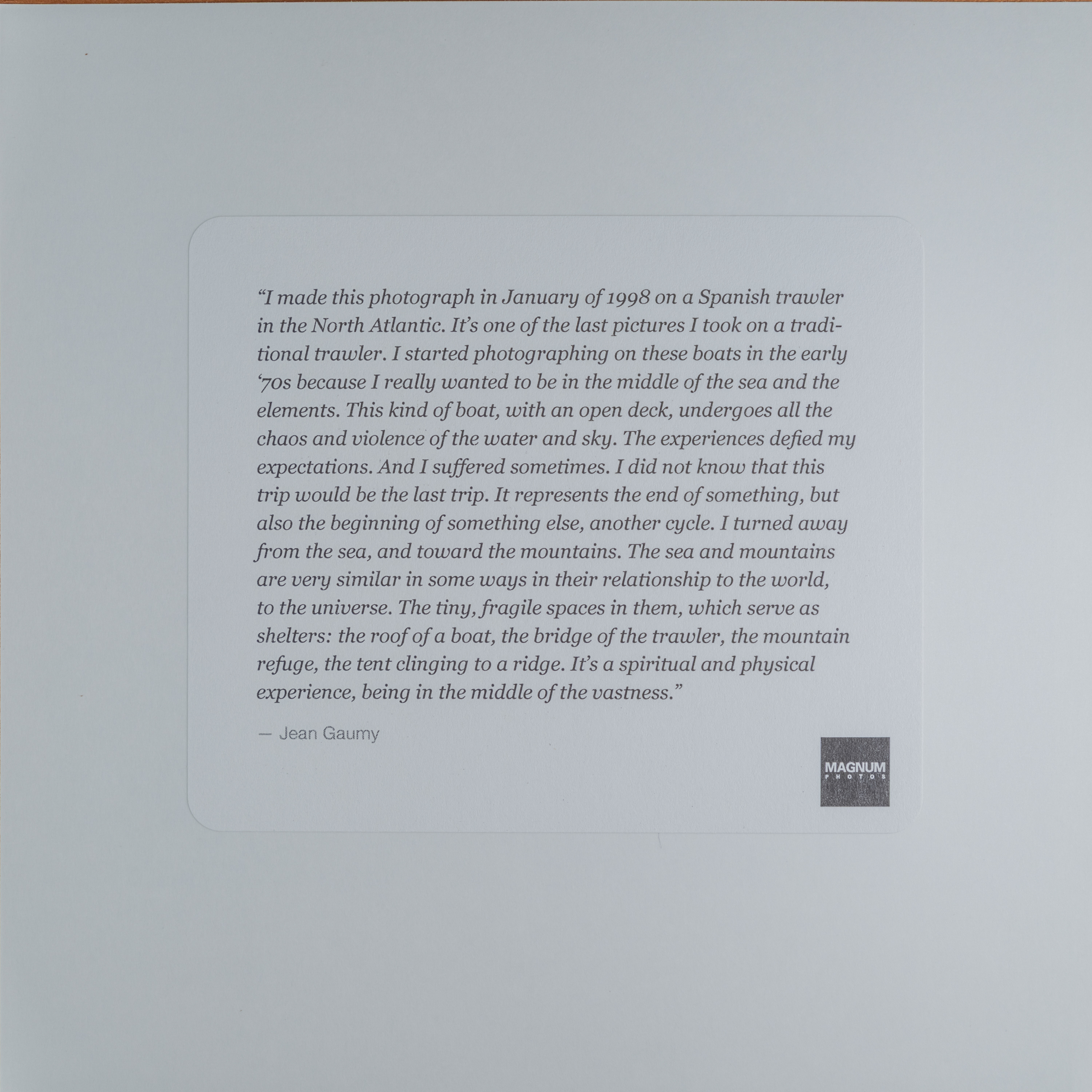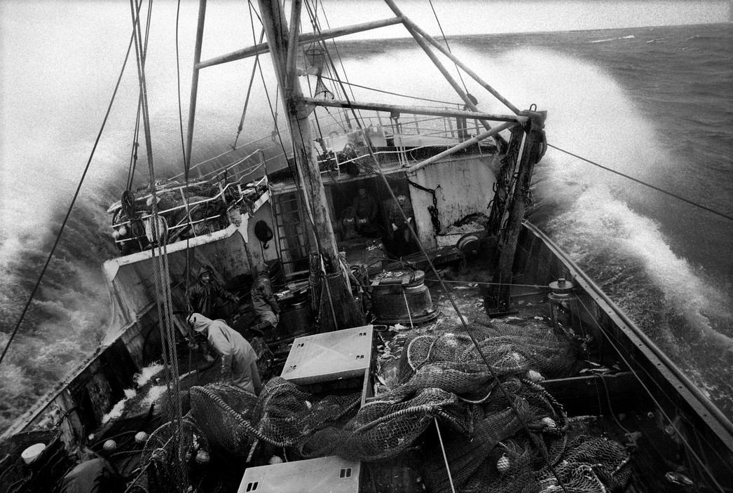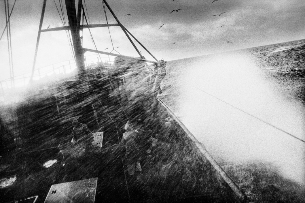 “这张照片是我于1998年1月,在北大西洋上一艘西班牙拖网渔船上拍摄的。它是我在传统渔船上拍摄的最后几张照片之一。我从上世纪70年代初开始在这些船上拍照,因为我渴望置身于大海与自然元素的中心。这类船只拥有开放式甲板,需要承受海水与天空带来的所有混乱与暴力。那段经历完全超出了我的预期,有时甚至让我身心俱疲。我当时并不知道,这次航行会是最后一次。它象征着某种终结,也预示着某种新的开始,另一个循环的开启。我转身离开了大海,走向山脉。