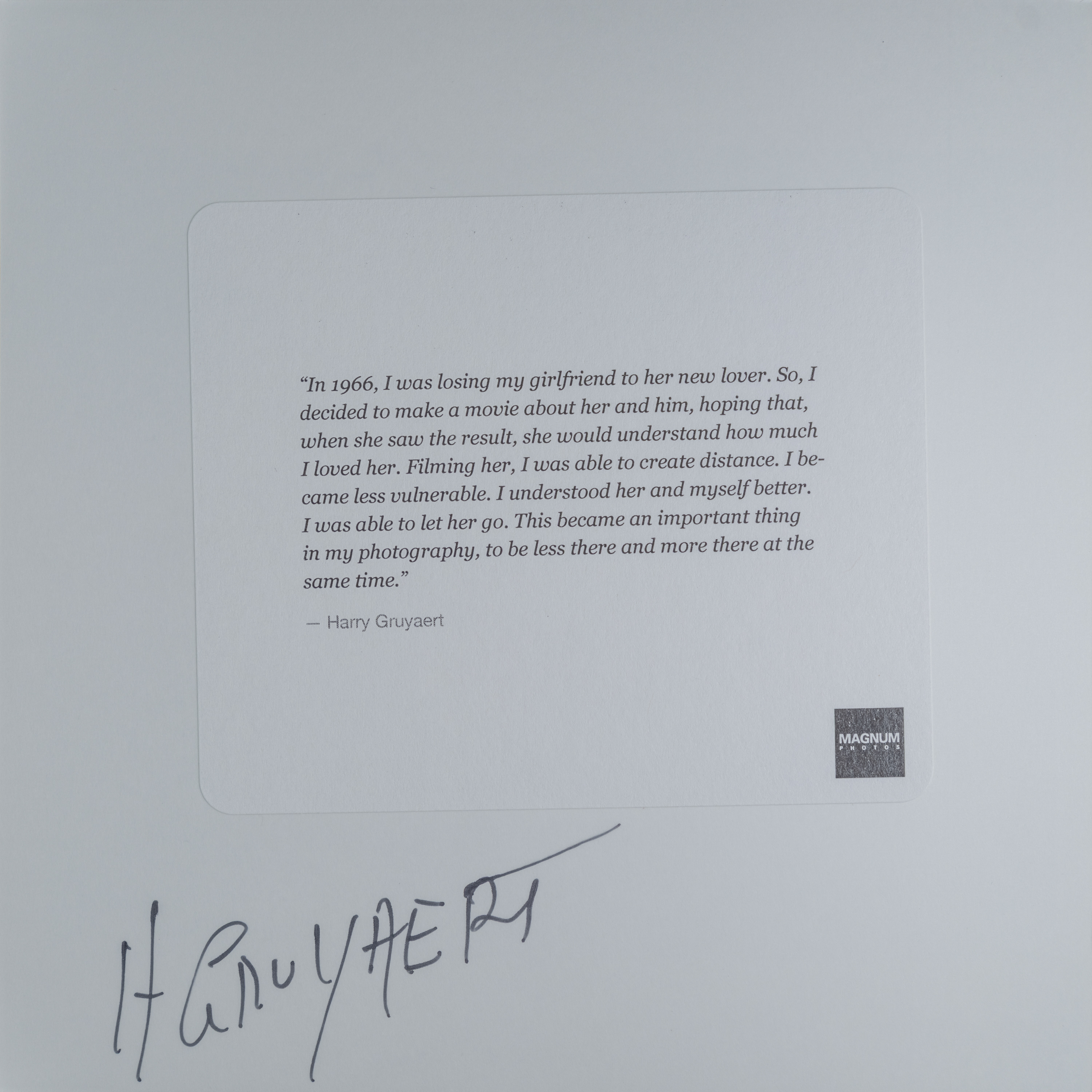 “1966年,我的女朋友爱上了别人,我正逐渐失去她。于是我决定拍一部关于她和他的新恋人的电影,心想或许当她看到成片时,会明白我有多么爱她。通过拍摄她,我得以拉开距离,不再那么脆弱,也更理解她与自己。我终于能够放手。这种经验成为我摄影中极为重要的一课:既要‘不在场’,又要‘更在场’。”